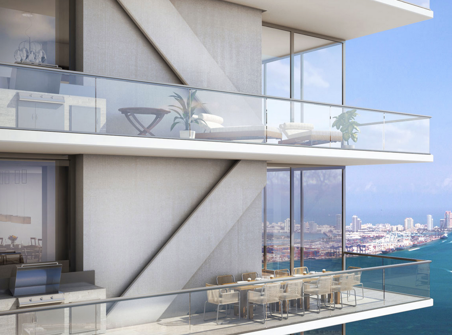 Building amenities include a vanishing-edge pool and deck with panoramic views of Biscayne Bay, Downtown Miami, South Beach and the Atlantic Ocean, state of the art fitness center and spa overlooking pool, Biscayne Bay and Downtown Miami, resort-style poolside food and beverage service, four hot tubs with bathing deck overlooking the spectacular Brickell skyline, concierge services, and robotic parking. Oh, and if you’re interested in one of the penthouses, your purchase comes with a brand-spankin’-new Tesla Model S. Starting prices for penthouses are around $10 million.